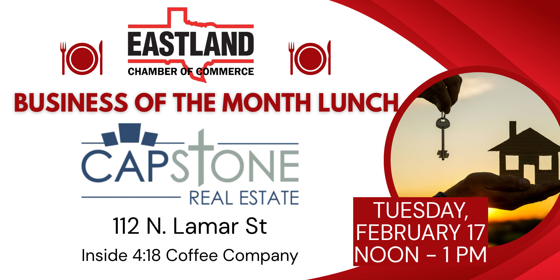 🎈🎈Tuesday, February 17, Noon - 1 PM Business of the Month Lunch. Capstone Real Estate, 112 N Lamar St. Eastland