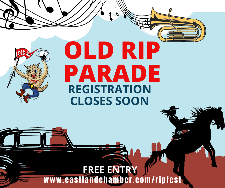 The Eastland Chamber of Commerce would like to invite you to take part in our 44th Annual Old Rip Parade on October 5th at 11:00 AM on the Main Street of Eastland. In recent years, Old Rip Parade had around 70 participants and we are optimistic that with the help of our local community and beyond that our parade will continue to grow!