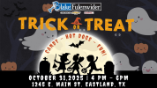 October 31, 2025 5:30 PM until goodies are gone. Under the Pavilion at Grimes Garden ******** If your business or organization would like a table to hand out goodies under the pavilion, call Debbie 254-631-0708