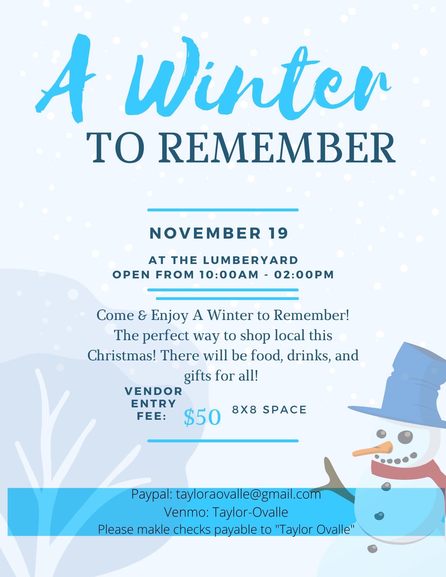Come &Enjoy A Winter to Remember! The perfect way to shop local this Christmas! There will be food, drinks, and gifts for all! Vendor Entry Fee: $50 8x8 spaceImages