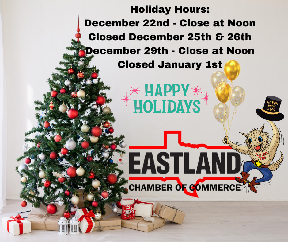 The Eastland Chamber of Commerce Office will be closing at Noon on Friday, December 22nd and will reopen on Wednesday, December 27th for the Christmas Holiday.