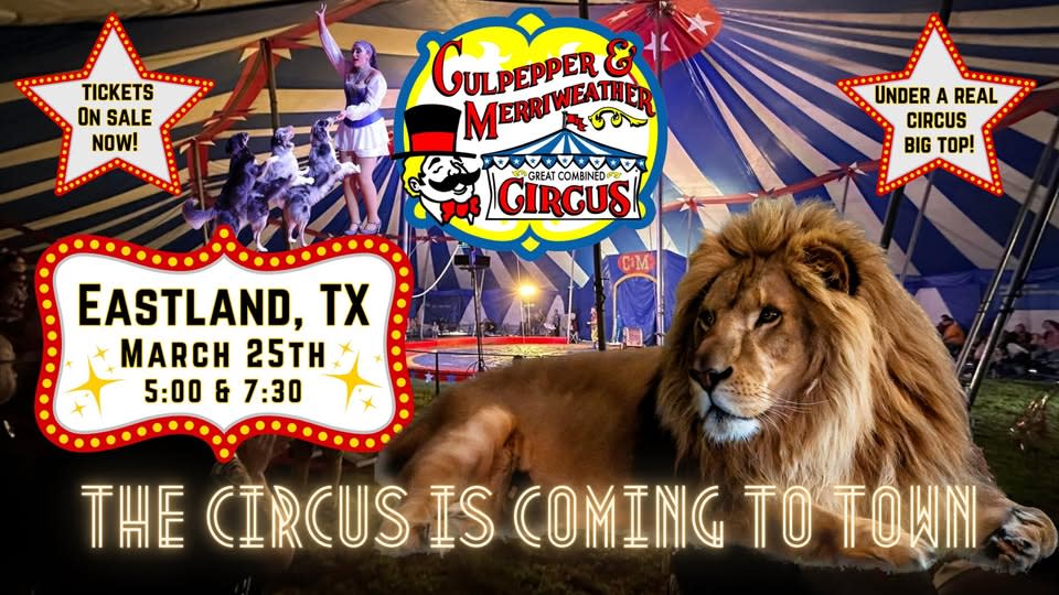 The Eastland Lions Club is excited to sponsor the Culpepper & Merriweather Circus on Wednesday March 25th! Tickets are on sale now at these locations: • First Financial Bank • Blake Fulenwider Dodge • Grandpaw's Tool Shed • Eastland City Hall • Texas Farm Bureau • Texas Bank • US Rentals • Eastland Chamber of Commerce