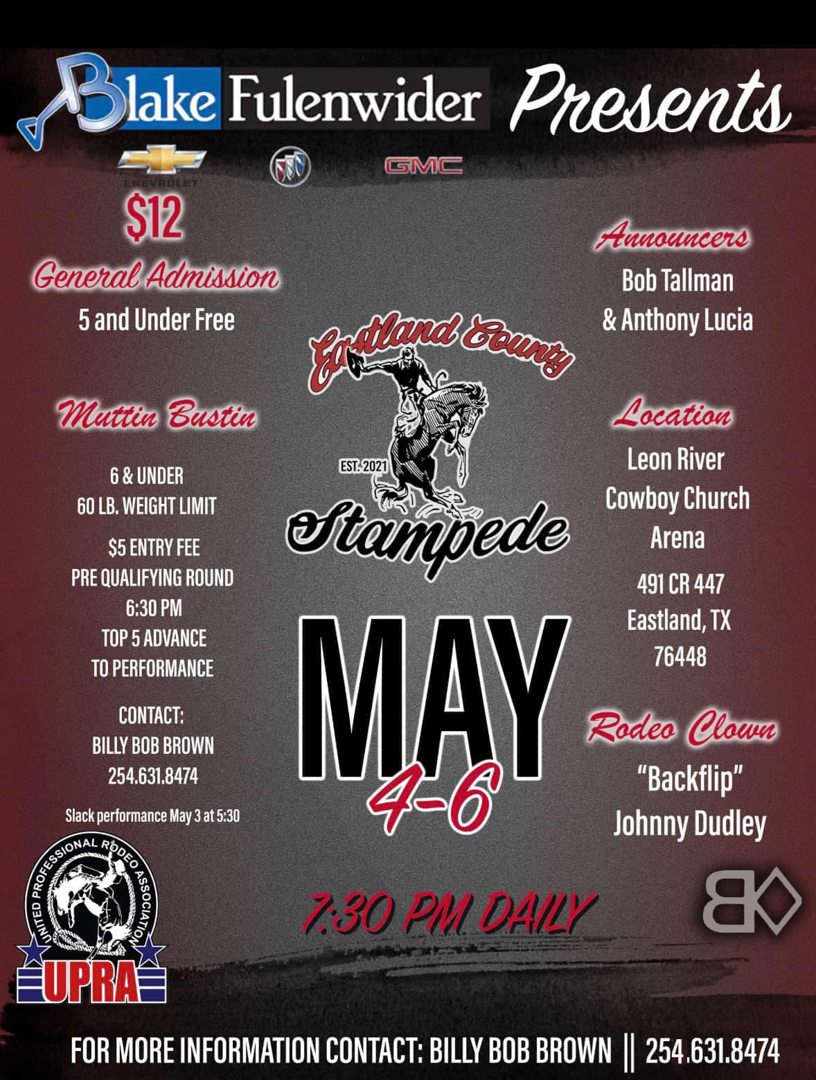 Rodeo, Muttin Bustin, Rodeo Clown. $12 general admission. $5 Muttin Bustin Entry. Located at Leon River Cowboy Church Arena. May 4-6. For more information contact Billy Bob Brown 254-631-8474