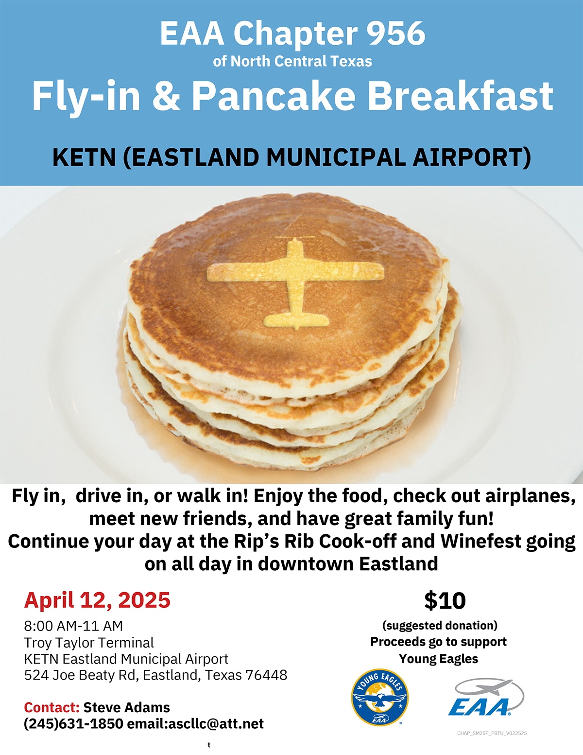 Fly in, drive in, or walk in! Enjoy the food, check out airplanes, meet new friends, and have great family fun! Continue your day at the Rip's Ribs Cook-Off & Wine Festival going on all day in downtown Eastland.